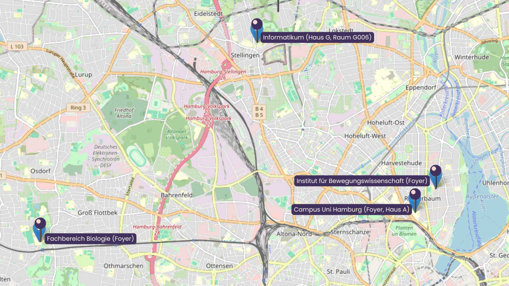 an verschiedenen Standorten der Uni Hamburg kostenlos - ohne Voranmeldung - nutzen. Wichtig ist, dass Du nach der Nutzung immer Deinen Code angibst.